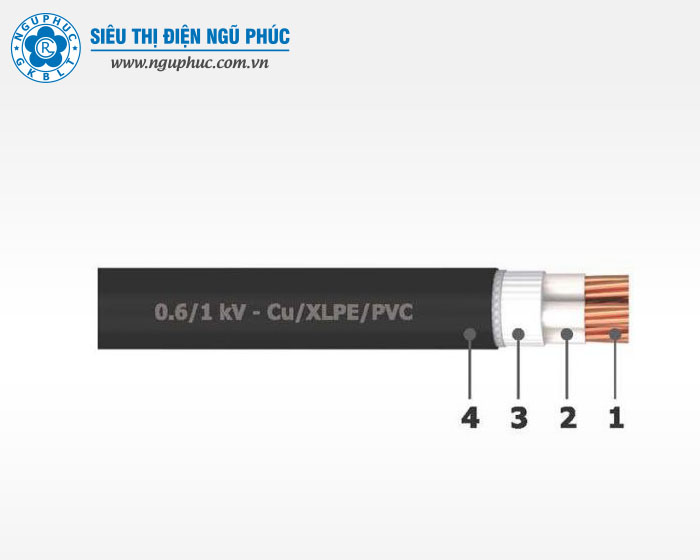 Cáp điện 4 lõi không có giáp bảo vệ 0.6/1kV - Cu/XLPE/PVC có kết cấu gồm 04 lớp như trên.