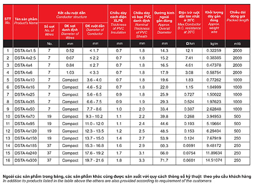 + Quy cách: Cu/XLPE/PVC/DSTA/PVC