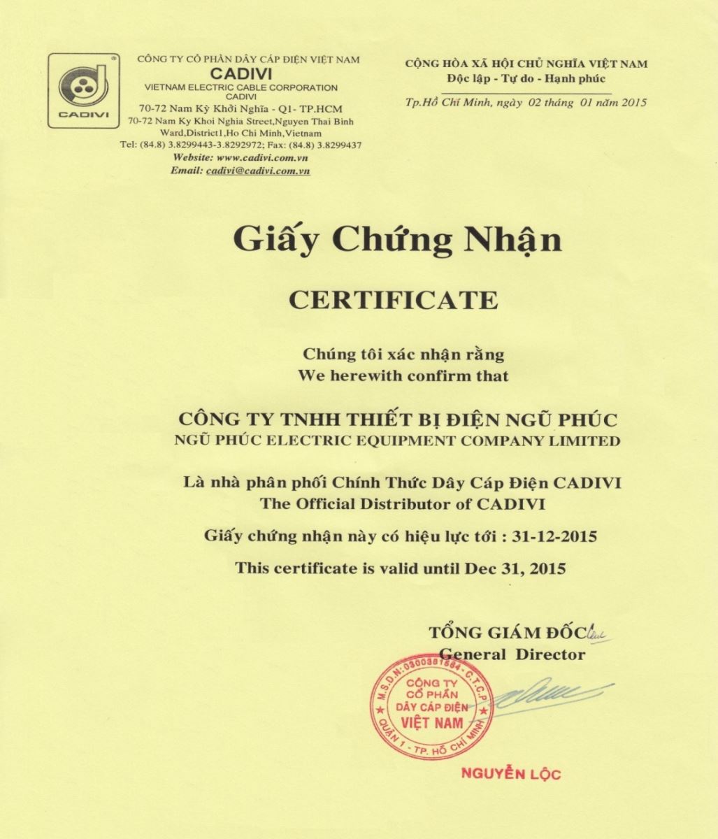 Siêu thị điện Ngũ Phúc tự hào là nhà phân phối, đại lý cấp 1 sản phẩm dây và cáp điện Cadivi tại Hải Phòng